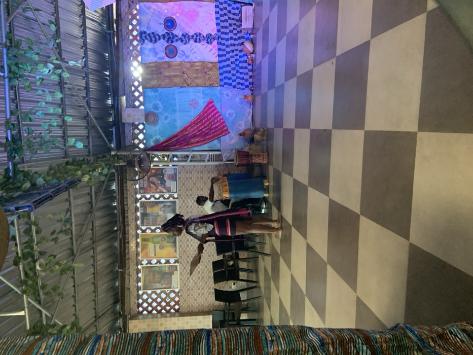 An indoor scene showcases a checkered floor. In the background, a wall is adorned with various patterned textiles and posters. A woman in traditional attire stands near a row of chairs. Drums and two chickens are positioned nearby. The ceiling structure is visible, with decorative foliage. The overall atmosphere appears vibrant and culturally rich.