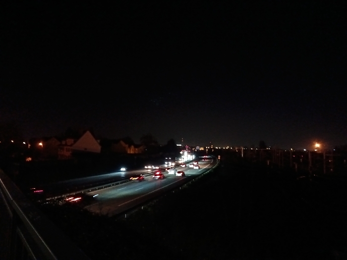 Nighttime scene of a highway with moving car lights streaking across the lanes. Adjacent to the highway are dark houses with some illuminated windows. A line of streetlights or building lights are visible in the distance. Faintly lit barriers or posts are seen on the right side of the frame, contrasting with the darkness. The sky is black, with some possible faint stars. The viewpoint is elevated, possibly from a bridge or overpass.