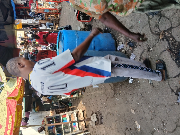 In a busy outdoor market setting, a person wearing a white jersey with the number 10 is positioned over a blue barrel. The market is crowded with various stalls and vendors, creating a vibrant scene. The surface surrounding the barrel is cracked and littered with debris. Another individual's arm is visible nearby. The focus is on the jersey and the urban environment.
