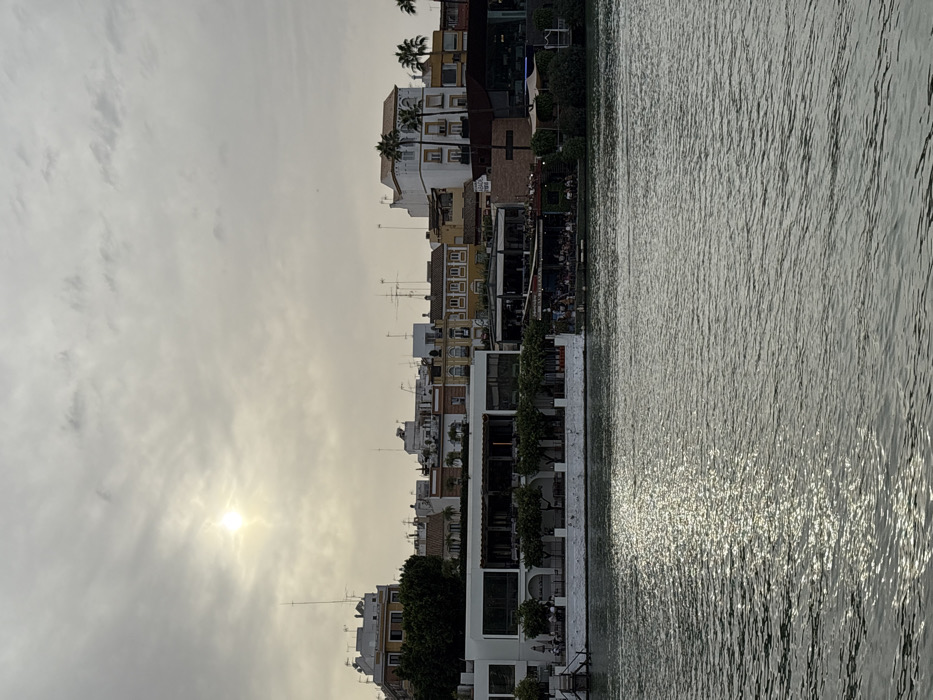The image displays a panoramic view across the Guadalquivir River in Sevilla, Spain, likely from the eastern bank looking towards the Triana neighborhood, under a largely overcast sky. The foreground is dominated by the Guadalquivir River, characterized by rippling, grey-green water. A shimmering path of sunlight reflects prominently on the water's surface, extending from the upper-left toward the lower-center. The midground features the river's far bank, lined with urban establishments. On the left, a multi-story white building with a modern aesthetic has dark-framed windows and a flat roof. Its lower level includes white arched sections fronted by small, pruned trees. An outdoor terrace here contains tables and chairs, occupied by several indistinct individuals. To the right, a series of additional commercial establishments are visible at the water's edge, each featuring crowded outdoor seating areas. Numerous patrons are seated at tables, engaged in social interaction or dining. Green foliage partially obscures the rightmost section of the riverbank structures. The background consists of a dense urban skyline composed of various multi-story buildings. These structures exhibit a mix of architectural styles, predominantly featuring light-colored facades (white, cream, ochre) and red-tiled roofs. Numerous rooftops are equipped with antennae, satellite dishes, and other utility fixtures. Several tall palm trees are interspersed among the buildings, notably towards the right side of the frame. The sky is overcast with grey and white clouds. The sun, a bright, diffused disc, is visible in the upper-left quadrant, partially obscured by the cloud cover, casting a soft, yellow-golden glow across the scene. The overall lighting suggests late afternoon or early evening.