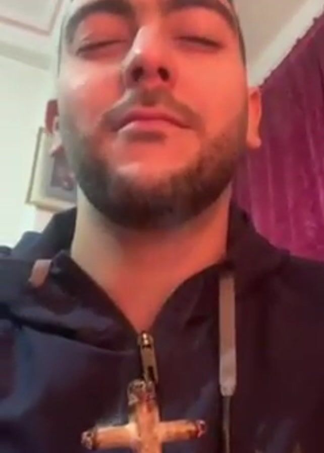A man is shown from the chest up. He wears a dark blue hooded sweatshirt, and in the foreground there is a cross-shaped object clipped to the zipper. The object appears to be made of rolled smoking materials. There is smoke rising from it. The man is looking at the camera and smiling with his eyes slightly closed. The lighting is reddish, and in the background are a white ceiling, part of a picture frame, and a magenta drape. The video is taken from a low angle looking up at the man.