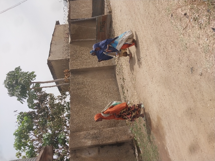 The image displays an outdoor scene in Bauchi, Nigeria, depicting an unpaved dirt path, a perimeter wall, and three individuals