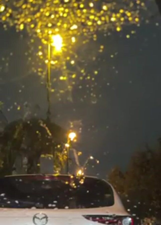nighttime scene viewed through a raindrop-covered windshield of a vehicle. A white Mazda SUV is visible in front. Street lights glow in the background, appearing blurry through the raindrops on the windshield. The sky is dark. The scene has a blurry, bokeh effect from the raindrops.