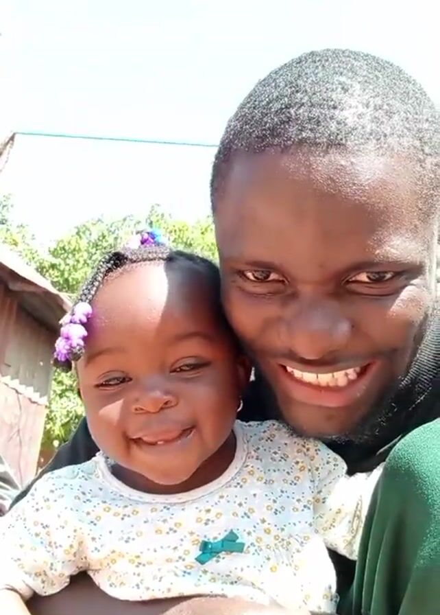 A close-up selfie video shows a man holding a toddler. The man has short, dark hair and a dark beard. He's wearing a dark-colored shirt with a green sweatshirt over it. The toddler is wearing a white shirt with small yellow and blue flower prints, and she has purple floral accessories in her hair, which is styled in small braids. They are both smiling and looking into the camera. The man waves to the camera. The background shows a sunny sky and glimpses of a building with a corrugated metal roof and some green foliage.