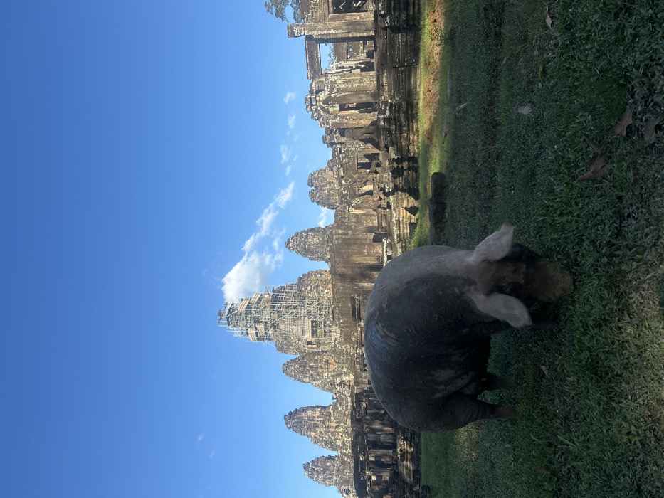 The image depicts a large, dark-colored domestic pig grazing in a grassy area in the foreground and mid-ground. The pig's hide is mottled with dark grey/brown dirt or mud, and its head is lowered to the green grass, with its pinkish snout and floppy ears visible as it roots or eats. In the background stands the ancient stone structure of Bayon Temple, located within Angkor Thom in Siem Reap, Cambodia. The central tower of the temple is extensively covered in scaffolding, indicating ongoing restoration work. Surrounding the central tower are other multi-faced stone towers and sections of the temple complex, displaying weathered grey stone and architectural details. The sky above is clear and bright blue with a few scattered white clouds. The scene is illuminated by natural light, casting shadows from the temple and the pig. No people are visible.