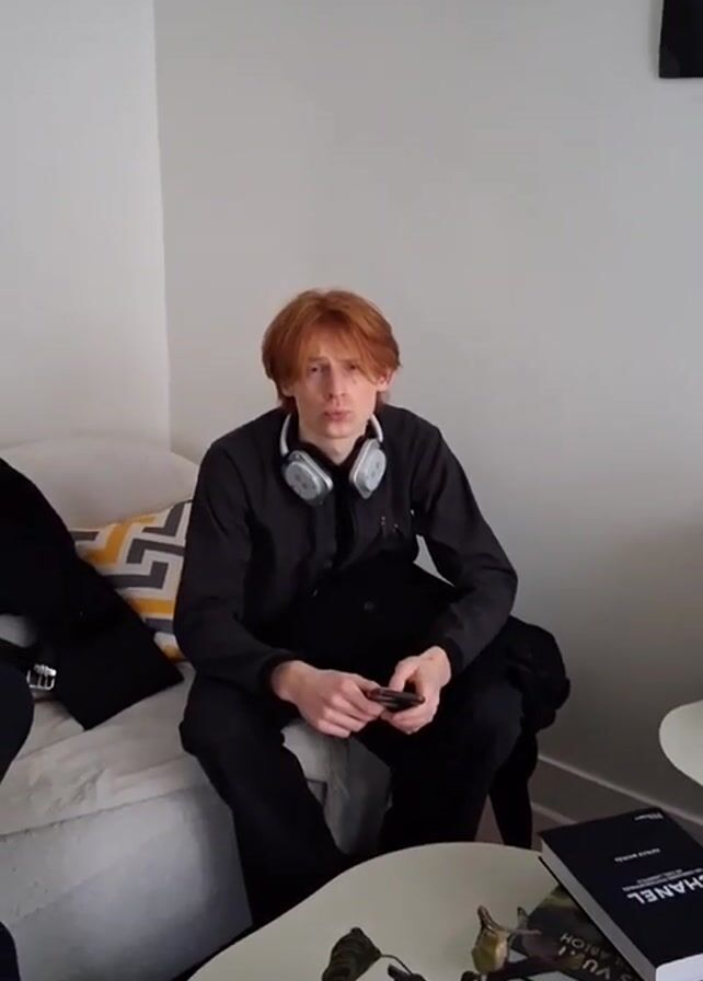 young man with red hair, wearing headphones around his neck and dark clothes, sitting on a light-colored couch. He is looking at his phone. There is a black jacket, and a patterned pillow on the couch next to him. A round, white coffee table is in front of him with books, magazines, and a small dead plant on it. A second, taller, white side table is on the other side of the couch. The room has white walls. The man looks up and turns his head slightly to the right. Another person, wearing a similar outfit, is sitting to his left.
