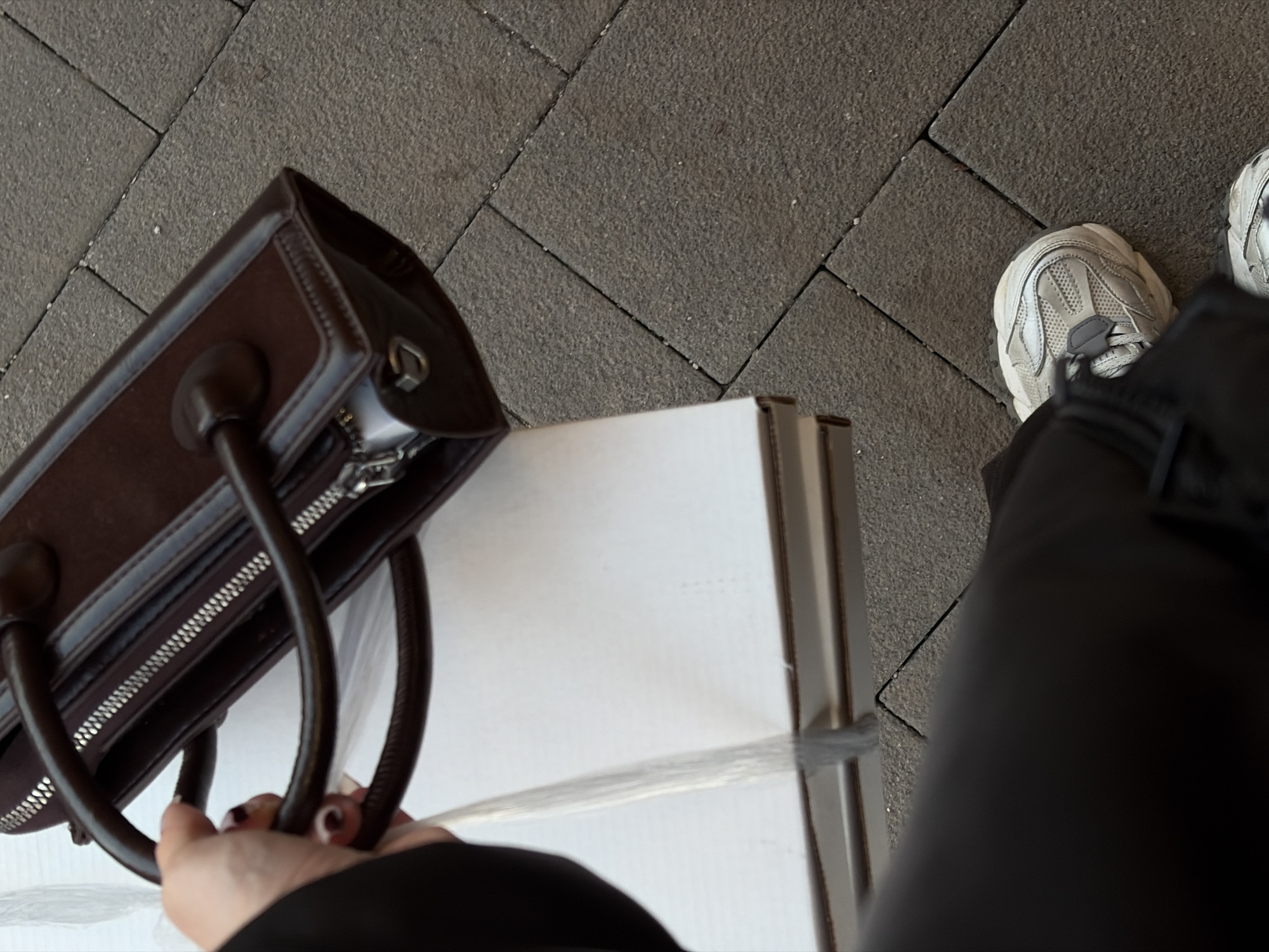 A first-person, downward-angle image captures an individual standing on a grey paved surface in the city of Moscow, Russia. The person's right hand, displaying dark red nail polish, holds the two rounded handles of a dark brown, structured handbag with prominent silver zippers along its top edge. Below the handbag and hand, a stack of white cardboard boxes, secured by a thin white string or ribbon, is visible. The lower portion of the image shows the individual's legs in dark trousers and their feet clad in white, chunky athletic sneakers with grey details. The ground is composed of textured, rectangular grey concrete pavers arranged in an offset pattern, with minor light debris scattered across the surface.