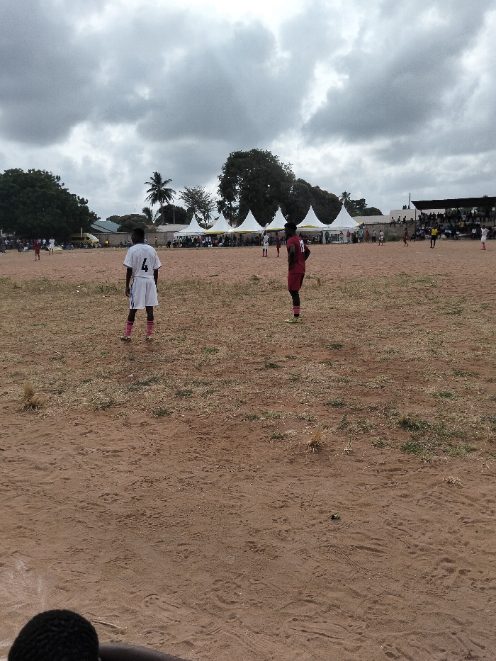 The scene depicts an outdoor football (soccer) field in Waa Ngombeni ward, Kenya, under a heavily overcast sky