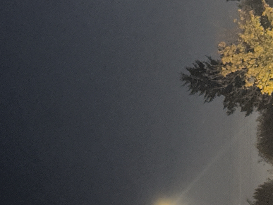 The image depicts an outdoor environment at night or late dusk in Strasbourg, France. The upper two-thirds of the frame consist of a dark grey sky, exhibiting a subtle grainy texture. In the upper-left quadrant, a bright, circular, yellow-white artificial light source, consistent with a streetlamp, casts a distinct beam of light diagonally downward and to the right, indicating atmospheric diffusion. The lower portion of the scene is occupied by vegetation. A prominent deciduous tree with illuminated bright yellow, autumnal foliage is situated in the lower-middle and lower-right. Behind and slightly to the left of this tree, a darker, coniferous tree is silhouetted against the sky. Additional indistinct dark foliage is visible along the bottom edge of the frame, particularly on the left. No individuals, specific man-made structures, or discernible actions are present.