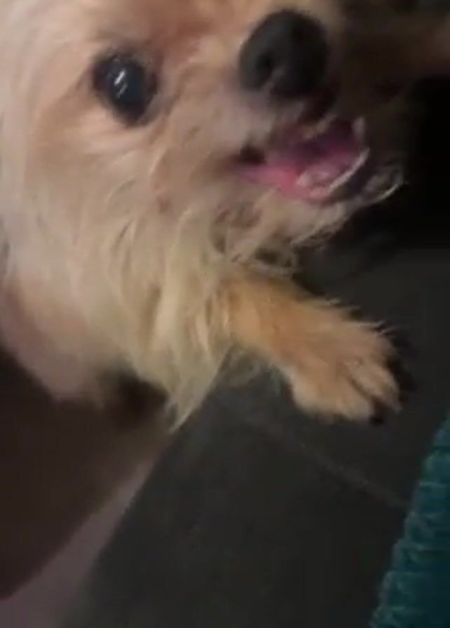 A small, light brown dog snarls, bares its teeth, and lunges forward in a blurry, close-up shot