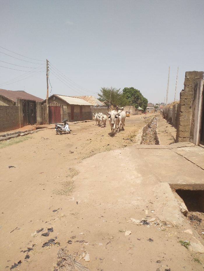 An outdoor scene depicts a dry, unpaved dirt road in the city of Unknown, Unknown, under a clear sky. A group of five light-colored Zebu cattle, characterized by humps and prominent horns, walk in a loose formation down the center-right of the road, moving away from the viewer. On the left side of the road, several low-rise structures are visible behind concrete block walls. The nearest visible structure features a dark brown metal double gate. A light-colored scooter is parked on the dirt shoulder between the road and the property wall. A wooden utility pole with multiple overhead power lines stands along this side of the road. On the right side, a partially constructed or dilapidated concrete block wall runs parallel to the road. A concrete drainage ditch, containing visible debris, separates the road from this wall. A concrete slab forms a ramp connecting to the dirt road in the foreground. The road surface is predominantly light brown dirt with scattered debris, including what appears to be plastic and fabric waste, along with dark patches of organic matter. In the background, further down the road, a yellow three-wheeled auto-rickshaw is visible, and additional distant buildings and sparse trees complete the horizon. No human figures are clearly visible in the immediate foreground or midground.