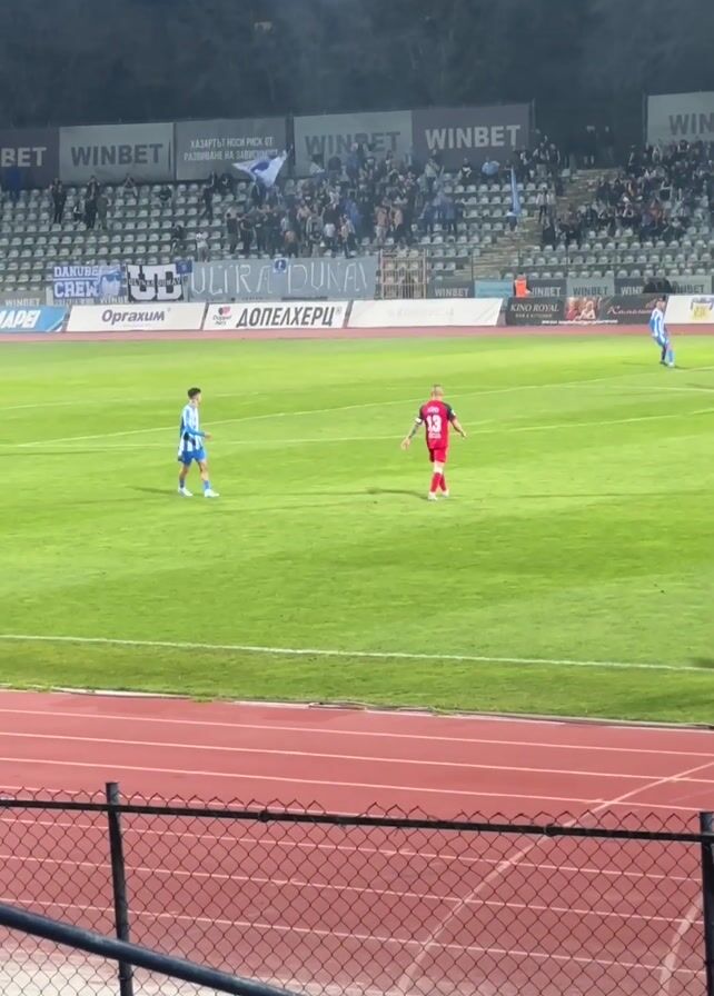 soccer game at night. The players, dressed in red and light blue uniforms, are on a well-lit green field. A running track surrounds the field, visible in the foreground. Behind the track, a tall chain-link fence provides a barrier. The stadium is packed with spectators, many of whom are cheering and waving flags. Banners displaying the words "ULTRA DUNAV" and "WINBET" are prominently visible along the stadium's upper tier. The sky above is dark and overcast.