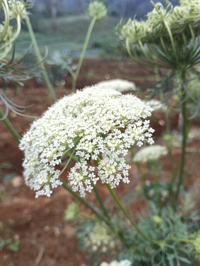 A vibrant white umbel inflorescence, composed of numerous small florets, dominates the foreground in sharp focus. Green stems and diffuse foliage emerge from beneath this central plant, rooted in reddish-brown soil. Multiple other developing green flower structures and mature white inflorescences are present, blurred in the midground and background. The distant horizon consists of soft, indistinct green and bluish-grey tones. No human individuals, animals, or artificial objects are visible. This scene is situated in Pinnwe, Myanmar (Burma).