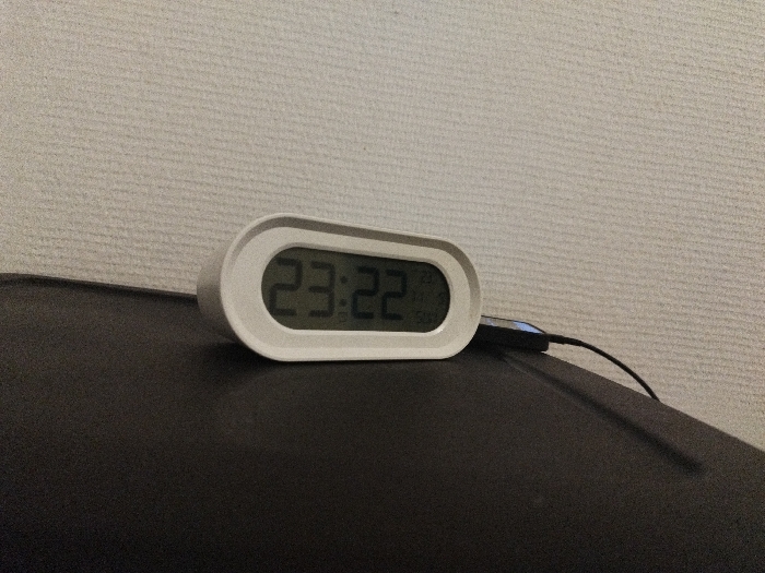 A digital clock shows 23:22 on a dark surface, likely a tabletop or desk