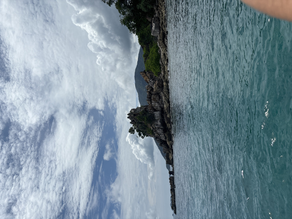 The image depicts a tropical coastal scene in Ban Ko Li Pe, Thailand. The lower half of the frame is dominated by clear, blue-green ocean water with visible surface ripples, suggesting calm conditions. In the midground, a prominent, rugged rock formation or small islet, characterized by dark grey stone and sparse green foliage including small trees on its peak, rises from the water. This formation is flanked to the right by a rocky shoreline densely covered with verdant vegetation. Further in the background, a larger landmass with lush green hills or mountains is visible. The sky above is partly cloudy, featuring a mix of clear blue patches and large, white cumulus clouds. A small, out-of-focus, light-toned limb is partially visible in the bottom right corner of the image, indicating the perspective is from a human, likely aboard a vessel or floating. No specific individuals, explicit actions, or direct interactions are visible within the depicted landscape.