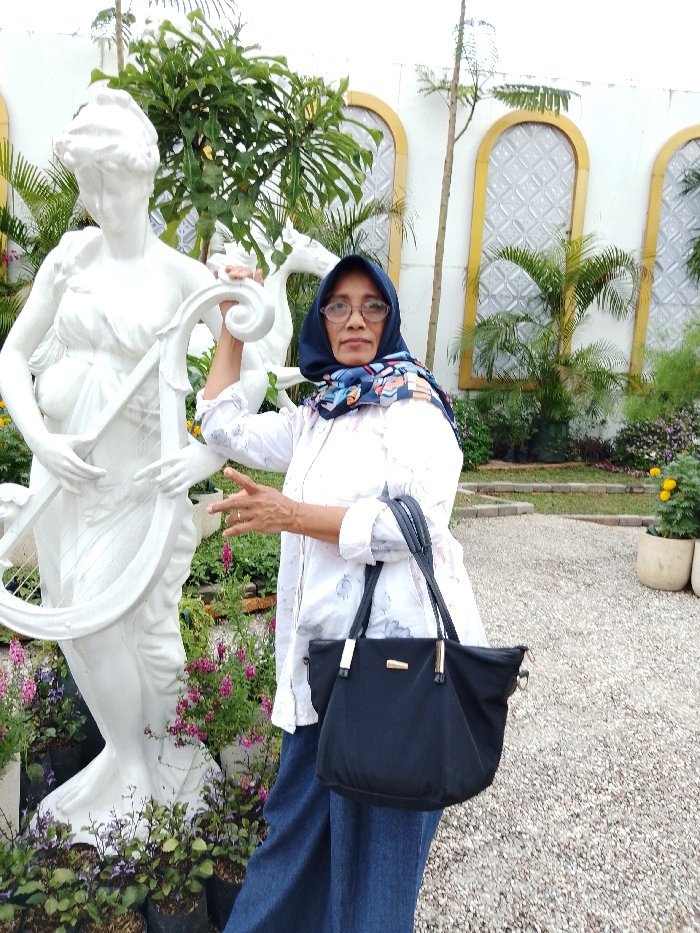 The scene is an outdoor landscaped area in Ngadirejo, Indonesia, featuring light-colored gravel ground. An adult female, wearing eyeglasses, a dark blue patterned hijab, a white patterned long-sleeved shirt, and dark blue wide-leg pants, stands to the right of a large white classical statue. The woman carries a dark blue handbag with black straps and gold-colored accents on her left shoulder. Her right hand grasps the statue's left arm, while her left hand is raised with fingers slightly spread, displaying a ring on her left ring finger. She gazes directly forward. The primary statue depicts a draped female figure holding a lyre. Partially visible behind it is a second white statue, appearing to be a horse. Numerous green plants and flowering vegetation, including purple, pink, and yellow blooms, are present in the foreground and midground, some housed in black polybags and white planters. The background consists of a white building facade with three yellow-trimmed arched recesses, each fitted with patterned translucent panels. Various taller plants and slender trees are also scattered within the background vegetation.