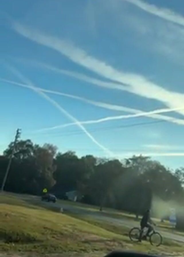 From the perspective of someone in a car, the video shows a cyclist riding along the side of a road. The sky is blue with many contrails forming a grid-like pattern. There are trees and a small building visible across the road. Other vehicles pass by on the road. The camera pans slightly as the car moves.