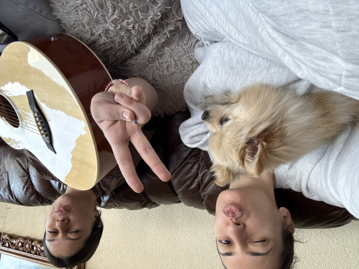 - "The image depicts two young adult females and a small dog situated on a brown sofa, with an acoustic guitar also present" by FM-CCOQt1, licensed under CC BY 4.0