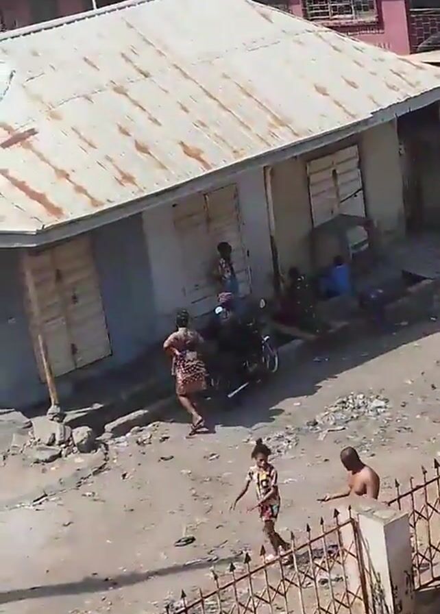 The video depicts an outdoor scene, likely a residential or commercial area, with visible signs of wear and tear. Several people are present. A shirtless man wearing dark jeans stands near a fence and appears to be interacting with a young girl wearing a colorful patterned shirt and a hair bun. Closer to the buildings, there are other people, including a woman in a patterned dress standing near a parked motorcycle. The buildings in the background appear to be old and have rusted corrugated iron roofs. The ground is uneven and covered with rubble and debris. The video is filmed from an elevated perspective.