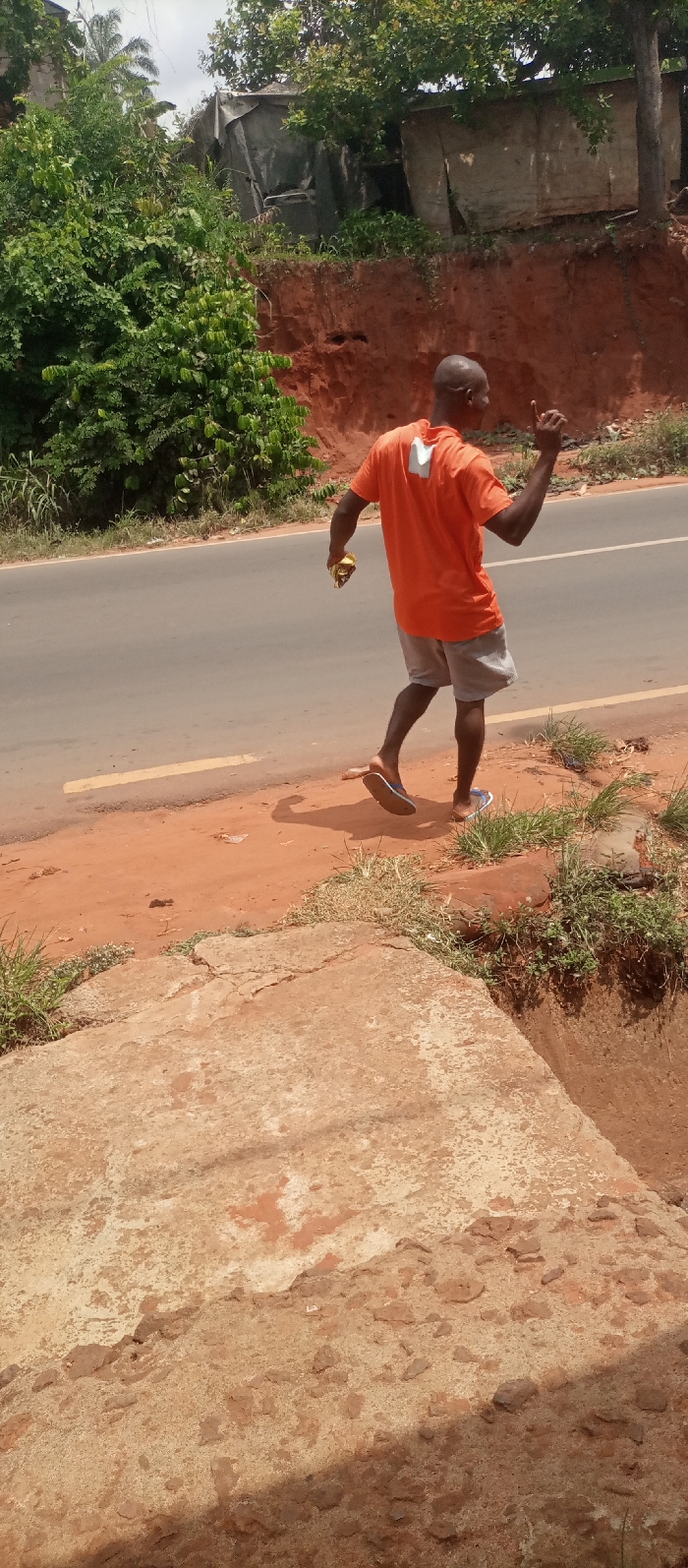 The image depicts a daytime scene in Ogidi, Nigeria, focusing on an adult male walking alongside a road