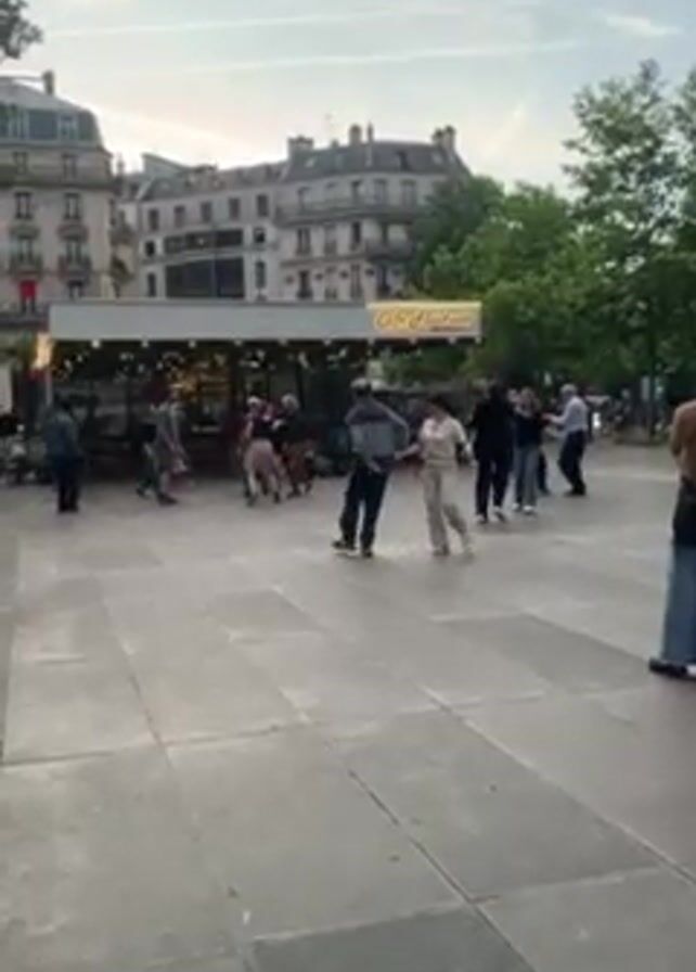 The video captures a lively scene in a European-style city square where several couples are engaged in social dancing