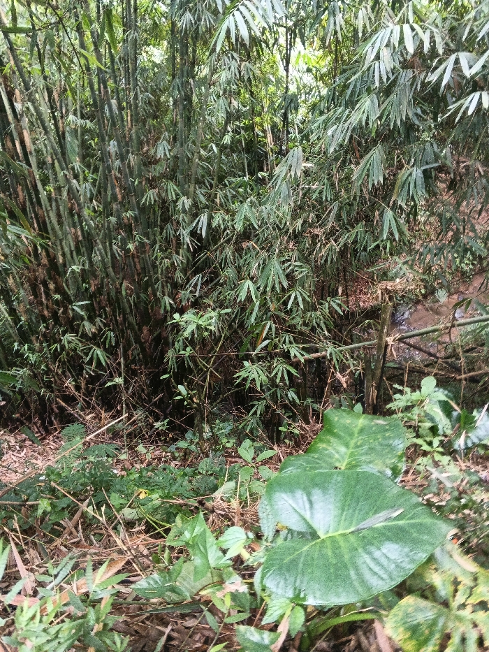 The image displays a dense vegetated area located in Bagochen Boolingpang Ueling, Bhutan. The scene is dominated by numerous bamboo culms, varying in diameter and height, forming a thick cluster across the background and midground. The culms are predominantly dark green with some brownish tones, supporting extensive green bamboo foliage with elongated leaves that create a dense canopy. The ground level is covered with a mix of organic debris, including fallen bamboo leaves and scattered undergrowth. In the lower right foreground, a single large, dark green, broad leaf, possibly a *Colocasia* or *Alocasia* species, is prominent, exhibiting a somewhat reflective surface. A narrow stream of reddish-brown water is visible in the midground, partially obscured by vegetation, with visible earthen banks. No individuals, animals, or artificial structures are present, and no actions or interactions are occurring within the depicted scene.