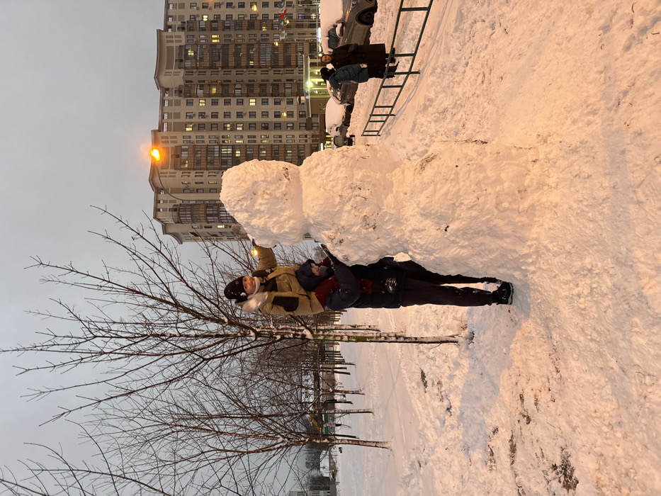 The image displays an outdoor winter scene in Odintsovo, Russia, at dusk or on an overcast day. In the foreground, a large, three-tiered snowman, exhibiting patches of dirt or debris, is being constructed. A person, attired in a light-brown winter jacket with a fur-lined hood and a black beanie, is positioned on the shoulders of a second individual. This second person is wearing a dark blue winter jacket, dark pants, a dark beanie, and a red scarf, providing support. The elevated individual is actively touching and shaping the uppermost section of the snowman, while the person below appears to be manipulating its mid-section. The ground is uniformly covered with snow. To the left, a linear arrangement of bare deciduous trees lines a snowy path or field. In the background, a multi-story, light-colored residential building with numerous illuminated windows is visible. An amber-glowing street light is positioned in front of this building. Below the building, several snow-covered automobiles are parked along a street, separated from the foreground by a low, dark green metal railing. Two additional figures, dressed in winter attire, are visible near the parked vehicles. The sky is grey and overcast.