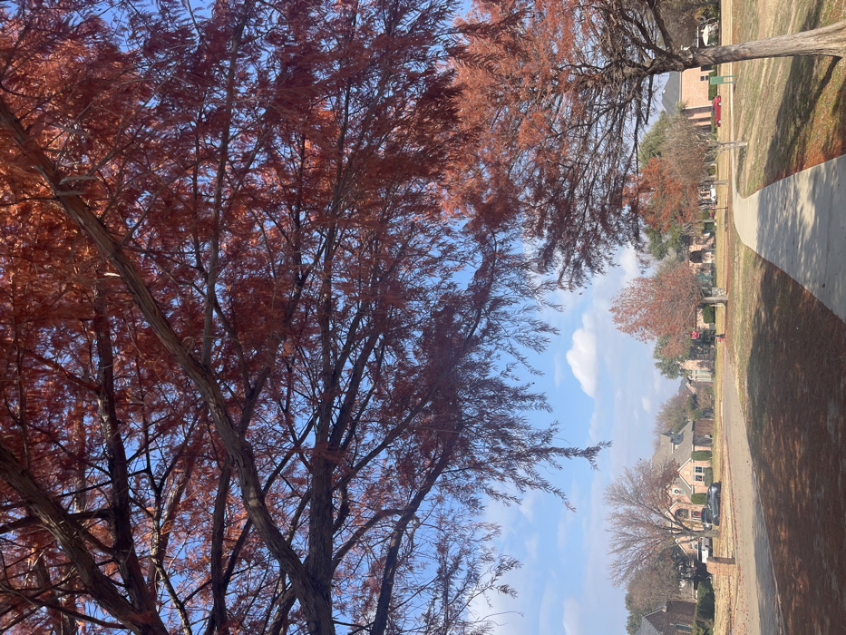- "A landscape image displays autumn trees with orange leaves against a pale blue sky dotted with clouds" by FM-SFpYu2, licensed under CC BY 4.0