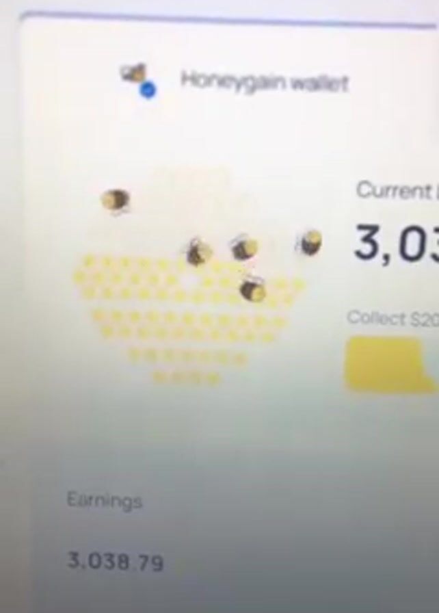 computer screen displaying the Honeygain wallet interface. The screen shows a honeycomb graphic, with animated bees flying around. The current balance is 3038 points. The earnings shown are 3038.79. The video is blurry and the details are difficult to see.