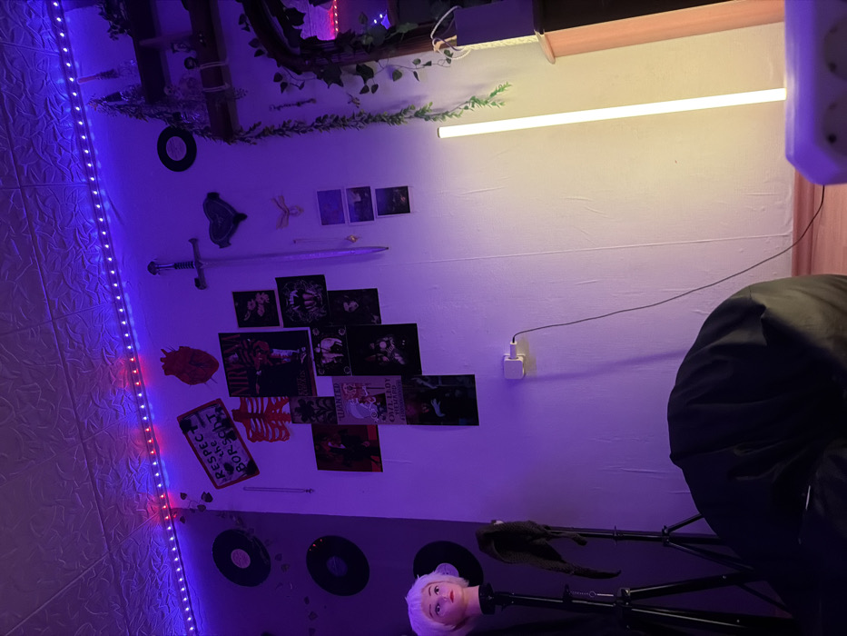 The room's decor is an eclectic mix with blue LED strip lights running along the textured wall
