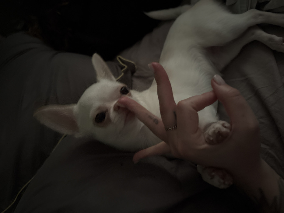 A white Chihuahua lies on a gray surface, possibly a bed, with dark shadows obscuring some areas. A hand with a ring on one finger touches the dog's nose, while the rest of the hand obscures the animal's paws. The Chihuahua looks directly at the camera with a playful expression. The lighting is dim, creating a cozy, intimate atmosphere.