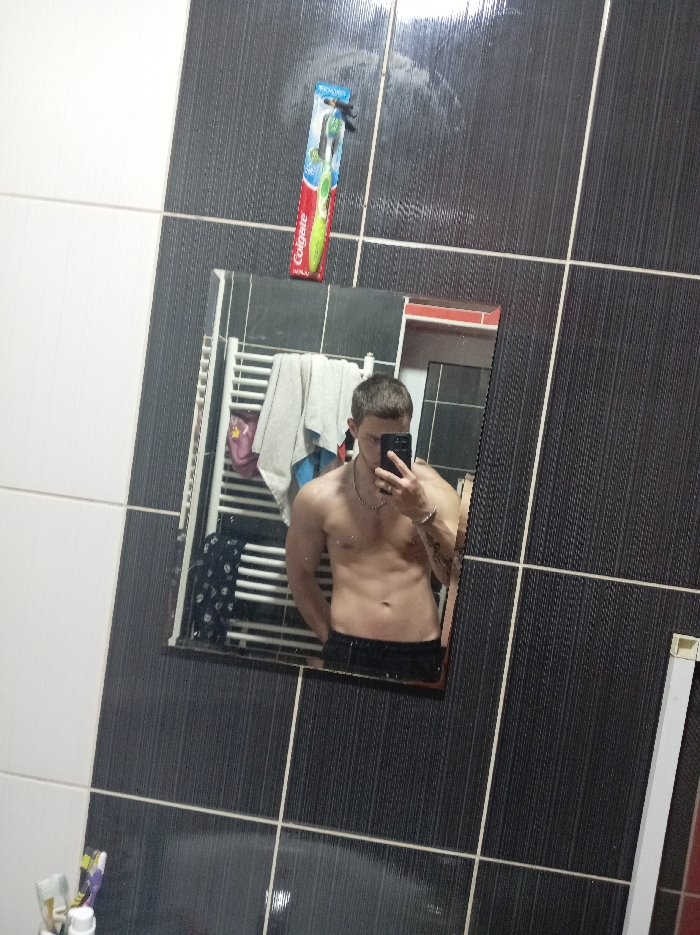 - "An image taken in a bathroom in Vetren Dol, Bulgaria, depicts the mirror reflection of a shirtless male individual from the chest to the upper thighs" by FM-qxCsA2, licensed under CC BY 4.0