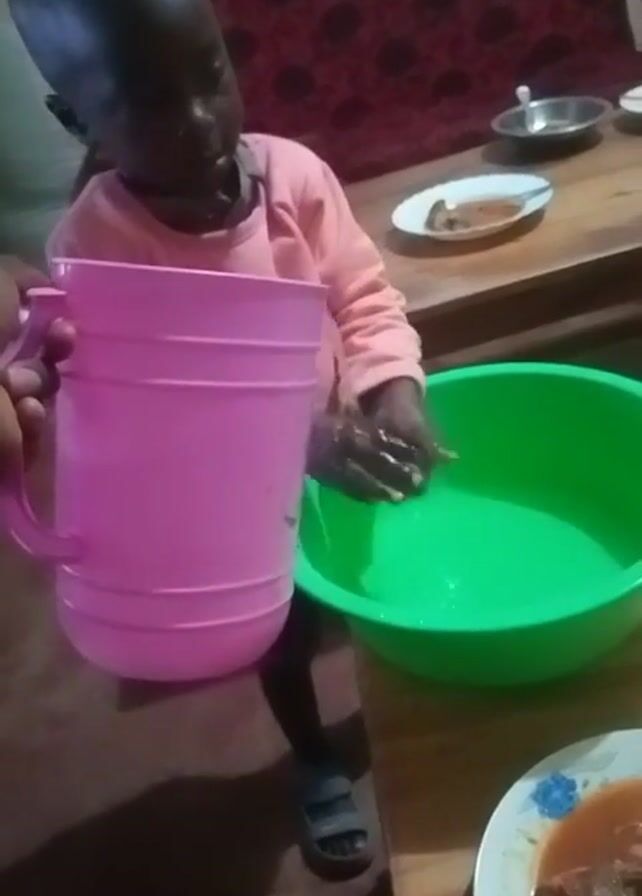 A young child is seen washing their hands at a table in what appears to be an indoor setting, possibly a home
