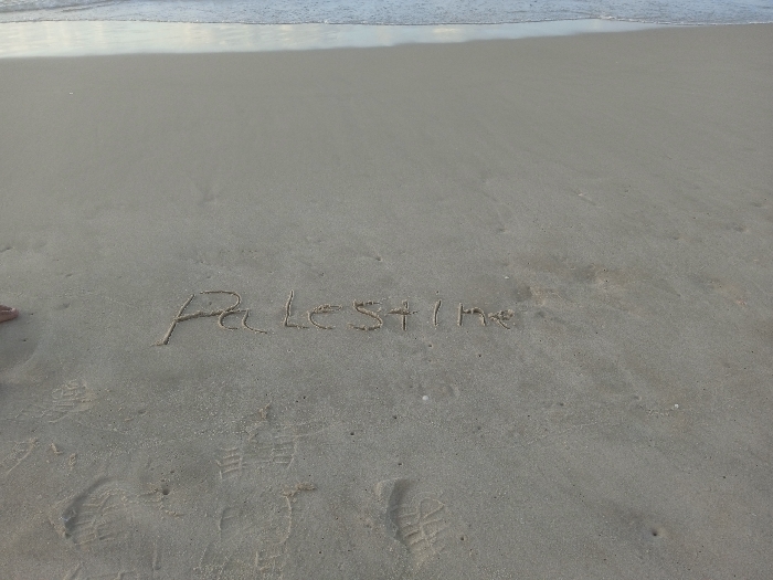 The image displays a sandy beach scene in Khan Yunis, Palestinian Territory