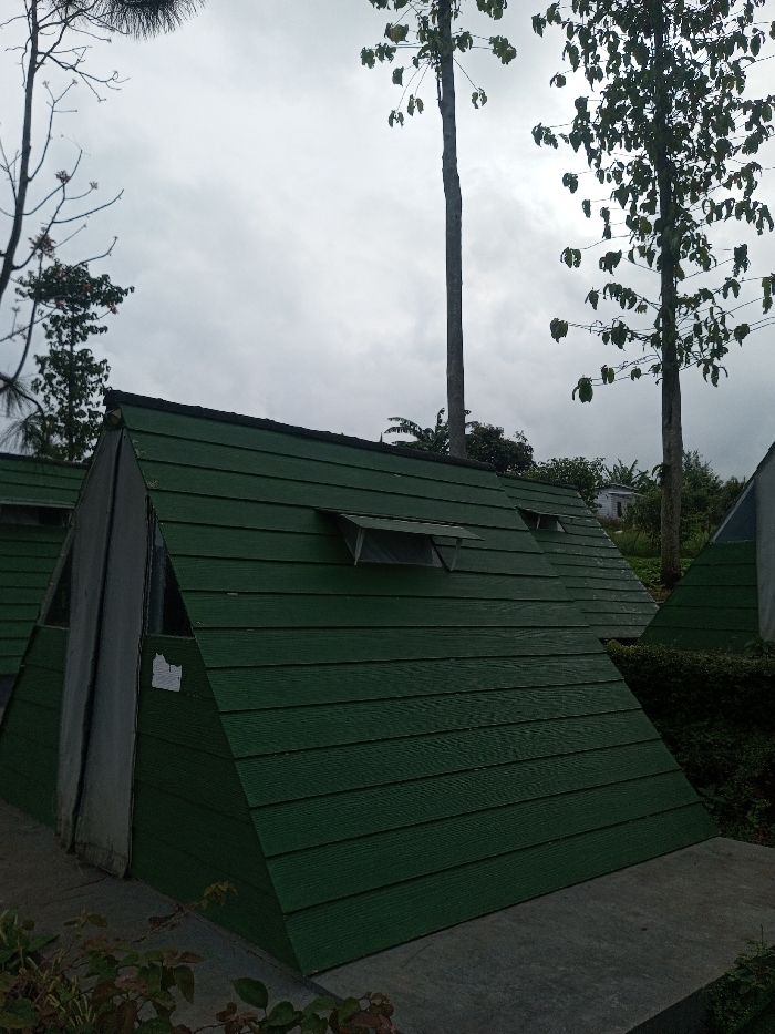 A static outdoor image depicts a dark green A-frame cabin, constructed with horizontal plank siding, situated on a concrete slab. The cabin's steep roof features a dark ridge cap and two vents; a prominent awning-style vent is positioned towards the left of the peak, and a smaller, recessed rectangular vent is further right. A light-colored, possibly canvas, panel or entrance is visible on the cabin's left-facing sloped wall. Portions of additional similar A-frame structures are discernible to the immediate left and right in the mid-ground. The surrounding environment includes various trees, some with bare branches and others with foliage, set against an overcast sky. Ground vegetation is present in the foreground and around the structures. A small, light-colored building is partially visible in the distant background among the trees on the right. No human subjects or discernible actions are present. The location is Abbireddygudem, India.