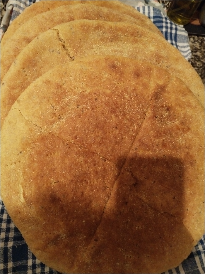 - "Four flatbreads rest atop a blue and white checkered cloth" by FM-3LPUP2, licensed under CC BY 4.0