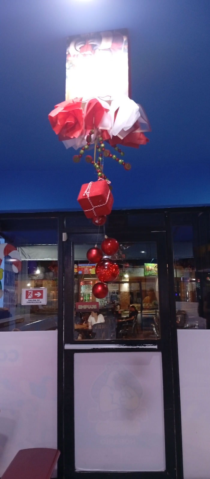 A festive Christmas decoration hangs from the ceiling, featuring a bright sign, red and white tissue paper flowers, green and gold beaded strands, a red gift-wrapped box, and a string of red ornaments