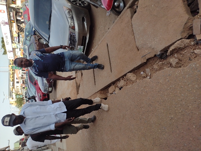 The photo shows a cracked and damaged sidewalk. A large split runs down the center, revealing dirt and debris underneath. Several people are standing on or near the sidewalk, including a man in jeans and a t-shirt who is gesturing towards the damage. Cars are parked nearby, suggesting the location is an urban area. The overall impression is one of disrepair and potential danger.