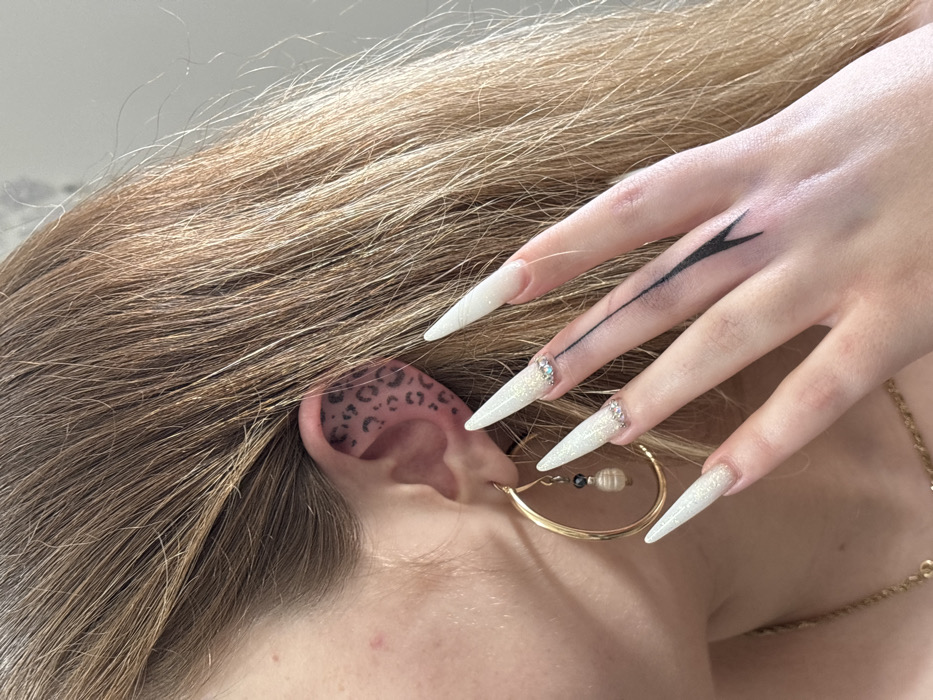 The image presents a close-up, cropped view of the right side of a female subject's head and right hand. The subject has long, light brown hair partially obscuring her ear. Her right ear displays a dark, leopard-spot patterned tattoo on its inner cartilage. A large, gold-toned, crescent-shaped hoop earring is present, from which a white pearl-like bead and a smaller black bead are suspended. The subject's right hand is positioned in the foreground, featuring long, pointed, stiletto-shaped artificial nails with a white glitter finish. The ring finger of the right hand has a black line tattoo running lengthwise along the finger, terminating in a V-shaped point. Small, clear rhinestones are affixed horizontally near the cuticles of the middle and ring finger nails. A gold-toned chain necklace is partially visible around the subject's neck. The background is a plain, light-colored surface, providing no specific environmental details. There are no visual indicators within the image to determine a specific location in Bat Yam, Israel.