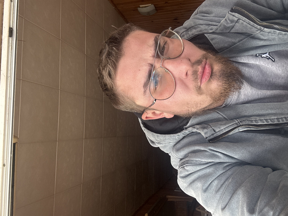 A male individual is captured in a close-up, chest-up portrait, looking directly into the camera. He has short, light brown hair and a light brown, well-groomed beard and mustache. He wears silver-framed aviator-style eyeglasses with a slight amber tint to the lenses, exhibiting reflections of ambient light. His lips are slightly pursed, indicating a neutral or contemplative expression. He is dressed in a textured, light grey zippered hoodie, layered over a lighter grey t-shirt or sweatshirt that features a black "Jumpman" logo on the left chest. The background suggests an indoor or covered outdoor setting. A light beige-brown tiled ceiling, composed of square panels with visible seams, is present in the upper half of the image, bordered by a white trim at the very top. To the right of the subject, a wall covered in horizontal wooden paneling is visible, alongside a small, light-colored object mounted on the wall. The left side of the background appears darker and more recessed, with less discernible detail. Illumination is bright, likely from a front or overhead source, casting reflections on the eyeglasses.