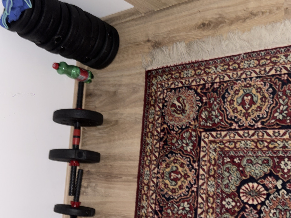 A dumbbell set with multiple plates and a green plastic bottle rests against a white wall. Nearby, a stack of black weight plates with blue cloth on top are also seen. The dumbbell has red and black components. The entire scene is set on a wooden floor, with a portion of an ornate, fringed area rug visible on the right side of the frame. The rug features a dark red background with detailed floral and circular patterns.