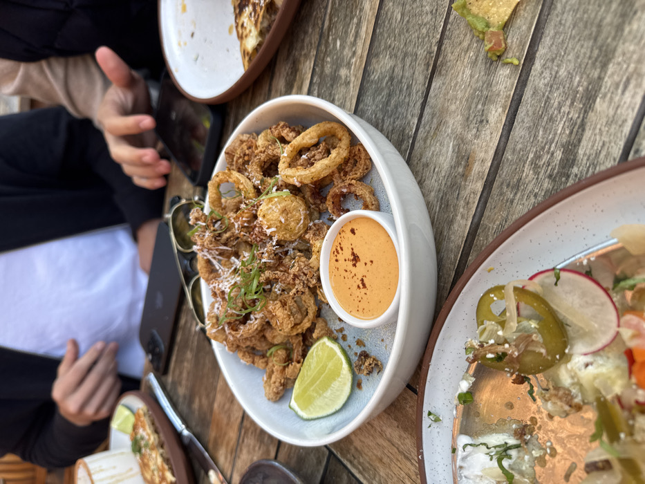 The image displays an overhead view of a wooden plank dining table in Boston, United States, set for a meal, likely outdoors. In the foreground, a large white bowl occupies the center, containing fried calamari garnished with grated white cheese and chopped green herbs. A lime wedge is placed on the rim, and a small white ramekin with orange dipping sauce, sprinkled with red spice, rests inside the bowl. To the lower left, a speckled white plate with a brown rim holds remnants of a dish, including a visible jalapeño slice, radish slices, and a creamy white sauce. Another speckled white plate, mostly empty save for a corner of a quesadilla-like item, is partially visible to the upper right. On the upper left, a brown-rimmed plate features a baked item resembling a quesadilla with a lime wedge and a silver fork. A small piece of a tortilla chip with green topping is visible on the far right of the table. Two dark-colored smartphones are placed flat on the table between the dishes, with dark aviator-style sunglasses resting on one of them. Two individuals are partially visible in the background; one wears a white t-shirt under a dark jacket, and the other has a light-colored sleeve, with their hands resting on the table near the phones. Their faces are not visible.