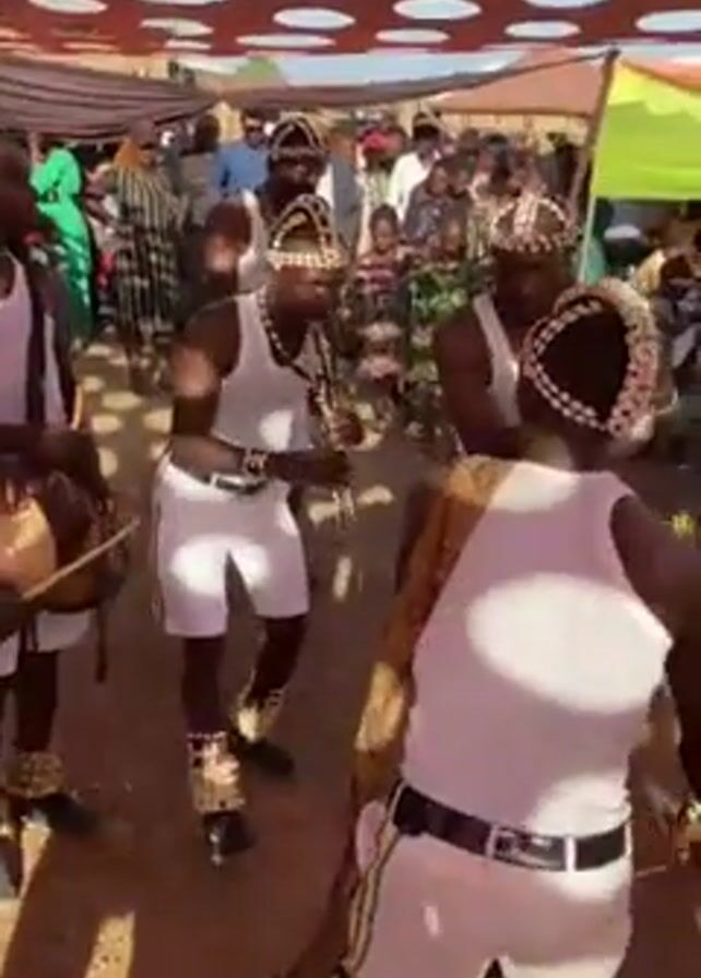 A group of men is dancing in a circle in an outdoor setting. The men wear white tank tops, white shorts with yellow and green trim, and black shoes. They also wear headdresses and wrist and ankle decorations. Some of the men are carrying and playing instruments. A crowd of people surrounds the dancers, observing them. The event appears to be taking place under a canopy or tent-like structure with a red and white polka dot pattern and green and white accents. The ground is covered in dirt or sand.