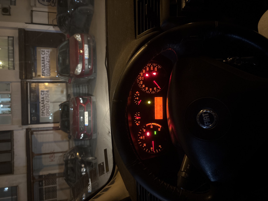 The image depicts an nighttime urban scene observed from the driver's perspective inside a Fiat vehicle