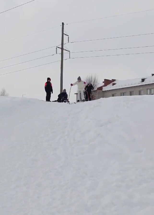 A girl in a white ski suit and red-handled ski poles skis down a snow-covered hill, losing control near the bottom and falling in a cloud of snow. Behind her at the top of the hill stand three figures; one seated and two standing. In the background is a grey sky, utility poles with power lines, a fence, and a brick building.