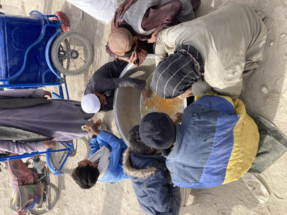 A group of people are gathered around a large metal pot containing a yellow food item. Some are kneeling, while others are standing. Individuals are using their hands to eat from the pot. Several are wearing hats or head coverings. A blue cart with a wheel and a bicycle are nearby. The ground appears to be dusty.