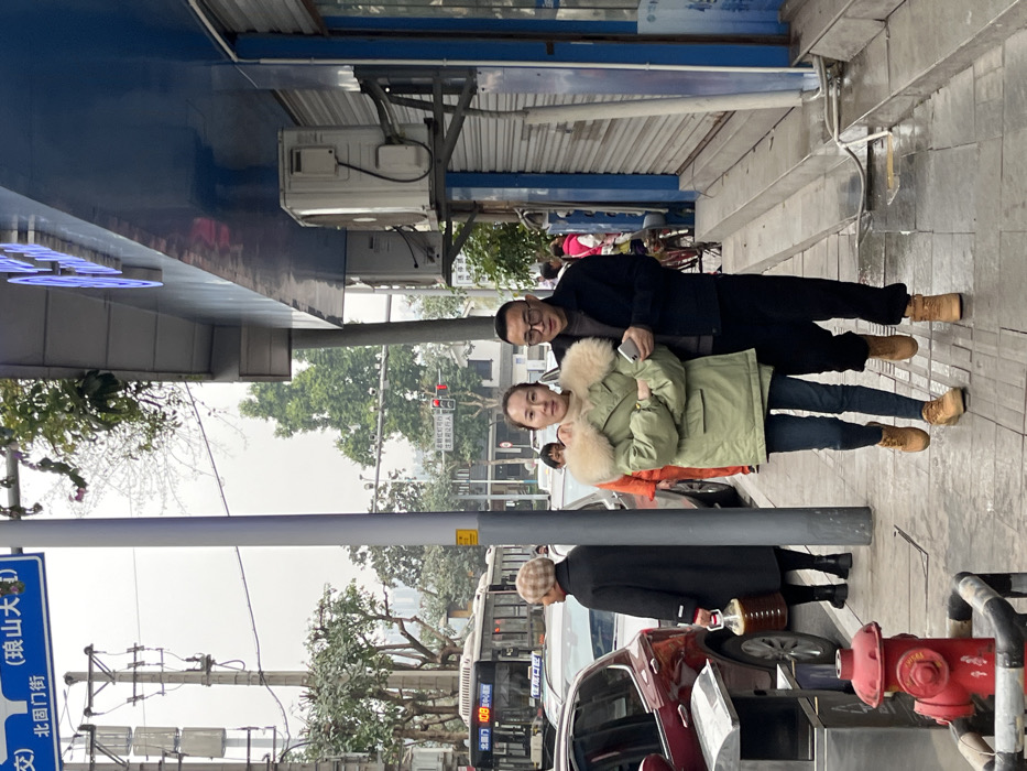A man and a woman stand close together on a city sidewalk, both wearing winter clothing and tan boots. The woman has a green jacket with a fur collar. The man, wearing glasses, holds a phone. A bus with the number 108 is visible behind them. Other pedestrians, cars, a fire hydrant, a street light and a street sign indicating Beiguo Men Street in Chinese characters are present in the scene. Air conditioning units are mounted on a nearby building.