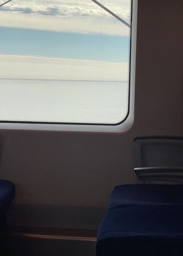 The camera is positioned inside what appears to be a train car, focusing on a window view. Outside the window is a body of water that stretches to the horizon. The water surface is a light gray, and the sky above is a mix of blue and white clouds. The interior of the train car includes blue seating and a muted gray wall. There is a slight swaying motion in the video.