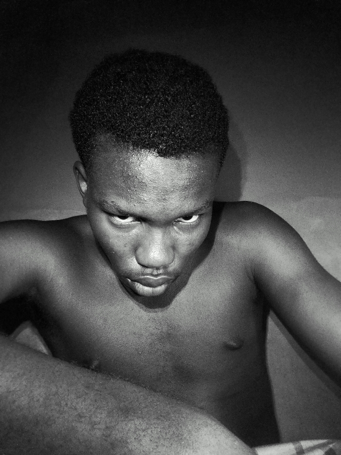 A high-angle, black and white photo features a shirtless, dark-skinned man with short, curly hair. His intense gaze is directed downward, conveying a sense of scrutiny or suspicion. The lighting emphasizes the contours of his face and upper body, casting shadows that add to the dramatic effect. The background is simple and slightly out of focus, drawing attention to the subject's expression and physique.