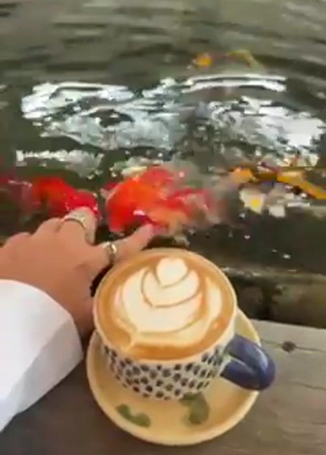 cup of coffee on a small plate resting on a wooden surface, with a hand gently touching a goldfish in a pond behind the coffee